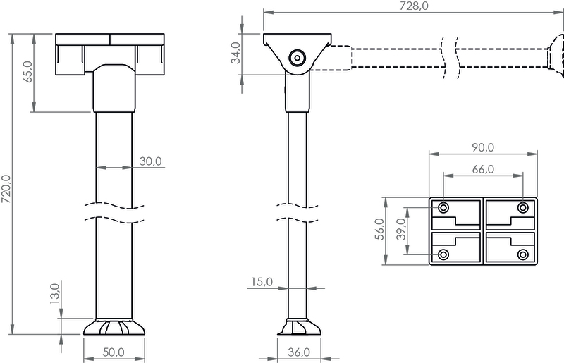 Gelenktischfuß silber, Gelenk oben, 720mm
