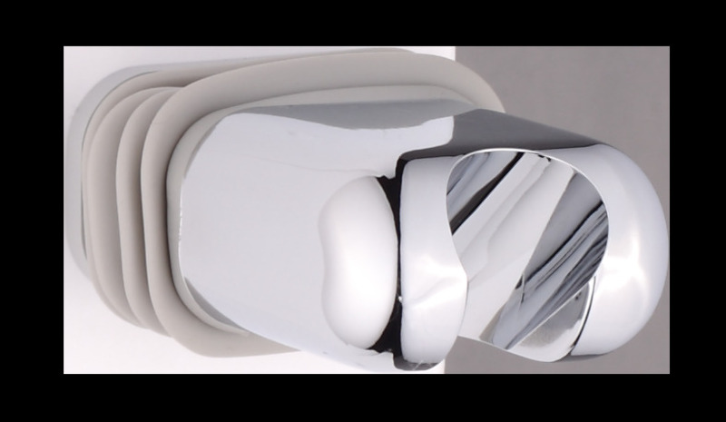 Konushalter aus Kunststoff, chromiert, zur Wandbefestigung. Er ist mit einem Anschlag versehen, um ein Abknicken des Brauseschlauches zu vermeiden. Es hat einen Wandbastand von 24 mm und ist seitlich schwenbar.