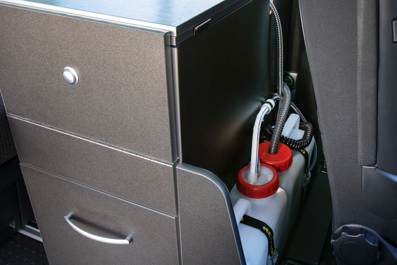 Küchenteil zum Einbau quer hinter den Fahrersitz des VW T6.1/T6/T5 California Beach und Multivan mit Original VW 3er Sitzbank. Korpus in Fahrtrichtung in VW-Bodenschienen verschiebbar. Die Calicook bietet eine Edelstahlspüle mit Dusch-Wasserhahn und Wasseranlage mit je einem 10-l-Frisch- und Abwasserkanister, einen Auszug für eine große 26-l-Kompressorkühlbox (optional) und Stauraum. Der praktische Klapptisch und das Auszugstablar machen das Küchenteil zum Frühstückstisch für alle. Der clevere Spritzschutz schützt das Polster des Fahrersitzes. Durch die Längsverschiebbarkeit kann jeder Fahrer bequem und entspannt sitzen. Auch bei eingebautem Küchenteil steht die volle Bettlänge zur Verfügung. Im Alltag kann Calicook zu Hause bleiben, sie ist im Handumdrehen ohneWerkzeug heraus-nehmbar. Natürlich kann man Calicook auch außerhalb des Fahrzeugs (z.B. im Vorzelt oder unter der Markise) nutzen.