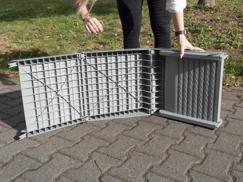Seitliche Sicherheitsränder, Rillenprofil für sicheren Halt. Faltbar, mit Tragegriff und Sicherungshaken.