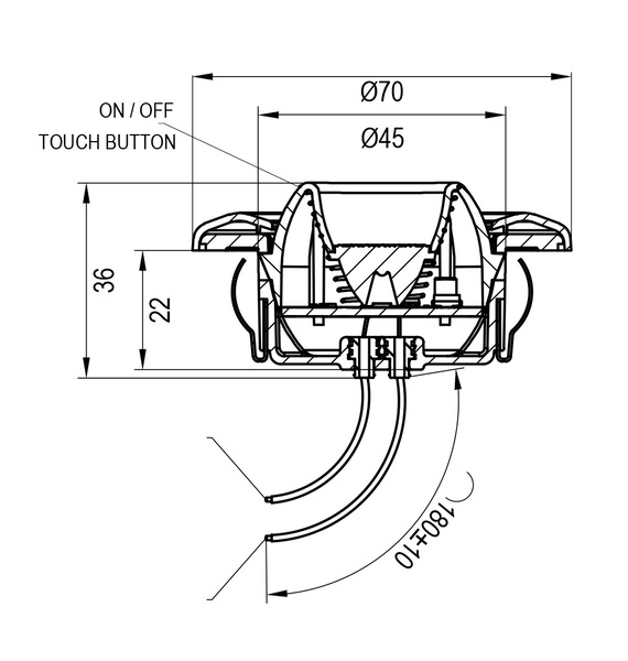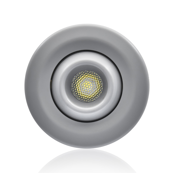 Schwenkbarer runder LED Einbauspot aus ABS Kunststoff mit Touchschalter und Klemmhalterung.