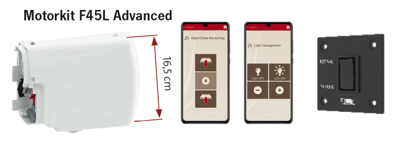 Die Motorkits für die F45S, F45L werden seitlich anstelle des vorhandenen Markisengetriebes an der Markise montiert. Die Advanced Version lässt sich per Smartphone steuern. Die Markisenbreite erhöht sich dadurch um 13 cm. Sollte kein Strom vorhanden sein, ist ein Notbetrieb per Handkurbel weiterhin möglich.