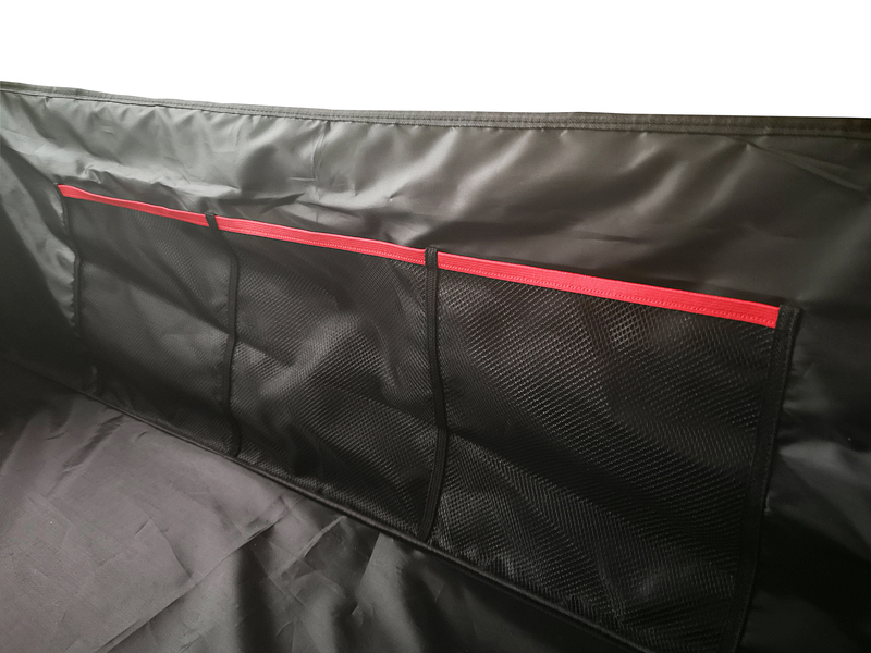 Mit 195 cm besonders lang, damit z.B. auch Skier transportiert werden können. Ausgestattet mit internen Kletthaken zum Blockieren der Ski und Nietenlöcher, damit kleine Wasseransammlungen entweichen können.
