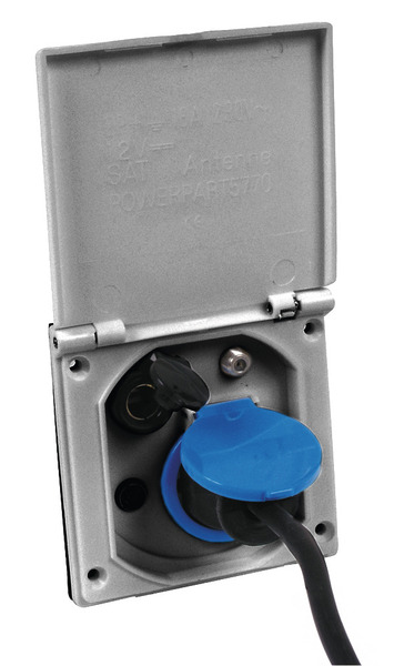 Multifunktions-Außensteckdose für 12/230V – Antenne/TV Sat. Farbe silbergrau. Maße 100 x 100 mm.