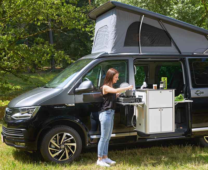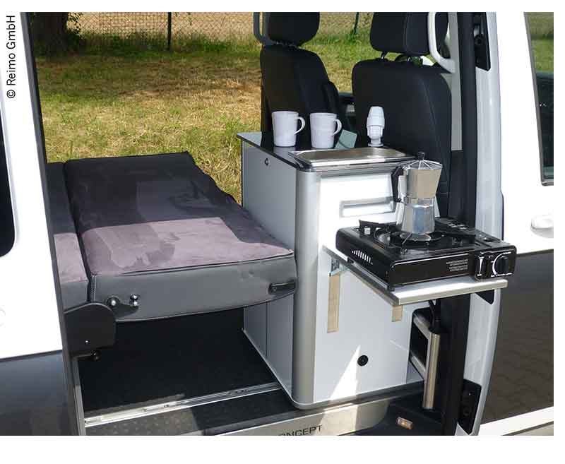 Küchenteil Hochglanz weiß zum Einbau rechts hinter Fahrerhaussitzen in VW T5/T6 Kombi/Caravelle in Verbindung mit einer Reimo-Schlafsitzbank V3000 (nicht passend für Multivan und California Beach). Die Easy-Küche kann auch in einen Mercedes Vito (lang Kombi) verbaut werden. Das Küchenteil ist herausschwenkbar mit optionalem Schwenkbeschlag. Eine Edelstahlspüle und eine Wasseranlage sind ebenfalls verbaut. Mit dem Easy-Küchenteil kann man ganz bequem außerhalb des Fahrzeugs kochen. Im Alltag kann das Küchenteil zu Hause im Keller oder auf dem Dachboden gelagert werden. Das Küchenteil wird vormontiert mit eingebauter Technik, inklusive Befestigungsmaterial für Reimo Bodenschienen geliefert.