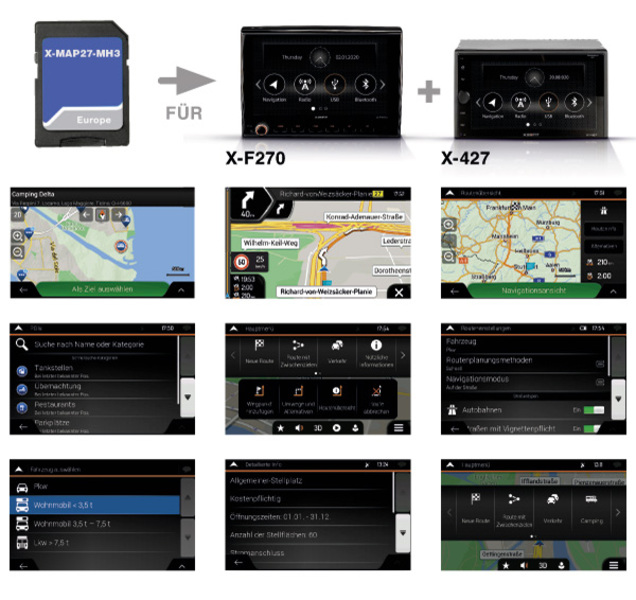 Erweitern Sie Ihr Infotainment-Systeme X-427 und X-F270 zum Naviceiver: Mit der speziell für Reisemobile ausgelegten Navigations-Software X-MAP27-MH1. 3 Jahre kostenloses Kartenupdate.