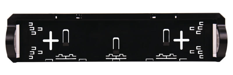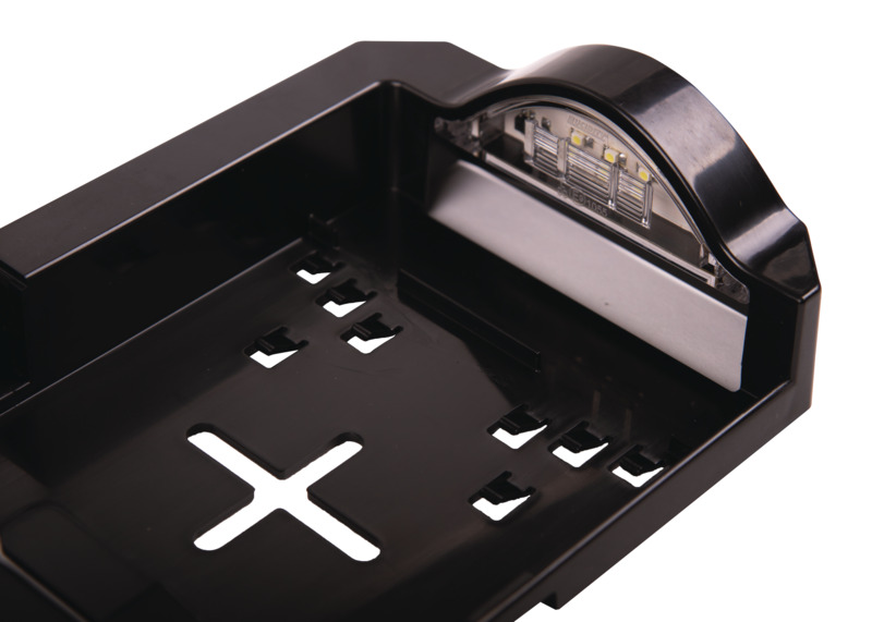 Integrierte LED-Beleuchtung auf beiden Seiten des Halters. Maße: 632 x 146 x 58 mm. Für Standard E-Kennzeichen. (520 x 120 mm).