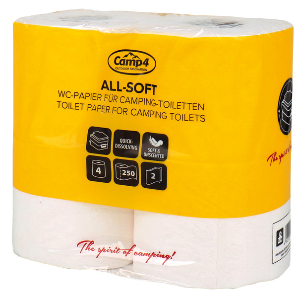 Toilettenhygiene: Spezielles, schnell lösliches Campingtoiletten-Papier, nicht parfümiert. Rolle à 250 Blatt, 2-lagig.