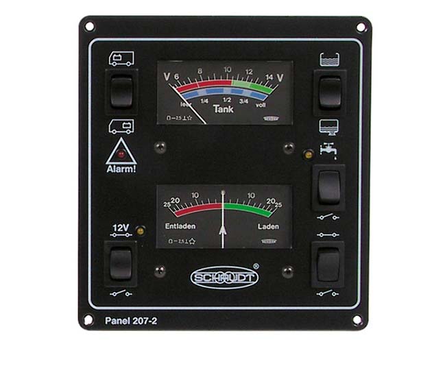 Die Spannungsanzeige für Starter- und Versorgungsbatterie (5-15 V) und Füllstandsanzeige für Frisch- und Abwassertank (in 4 Stufen) erfolgt über ein Zeigerinstrument, das automatisch bei Abfrage beleuchtet wird. Hauptschalter 12 V zur zentralen Abschaltung der Verbraucher. Pumpenschalter mit Kontrollampe (LED). Reserveschalter zur individuellen Selbstbelegung. Optische Tiefentladewarnung für Versorgungsbatterie. Zusätzlich mit 2. Anzeigeinstrument Messbereich: ± 25 Ampere zur Kontrolle des entnommenen bzw. eingespeisten Stromes.