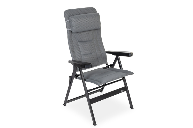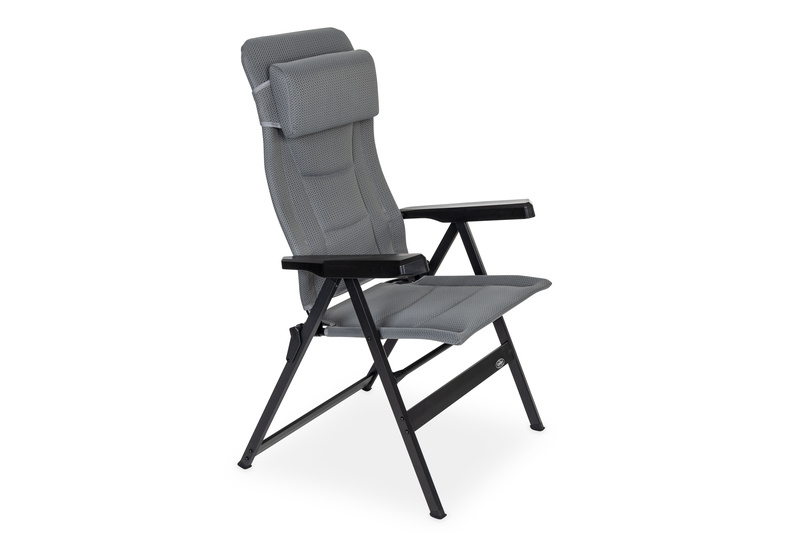 Der gepolsterte Campingstuhl verspricht durch die ergonomische Form, der 7-fach verstellbaren Rückenlehne und dem verschieb- und abnehmbaren Kopfpolster hohen Komfort. Der schnelltrocknende 2D-mesh Bezugsstoff (Polyester) hat ein neues Design in schimmerndem grau.