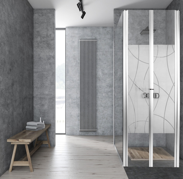 Elegante Duschtür mit 2 Schwenktüren. Eloxiertes Aluminium-Profil mit transparenter Acrylglas-Füllung. Die beiden Türen verbinden sich mit einer haftstarken Magnetleiste. In ca. 80cm Höhe sind die Scheiben mit einem Motiv im Digitaldruck versehen.