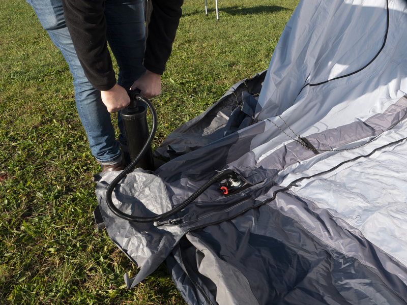 ✔ Zelt mit 1 Luftschlauch, 1 Luftpumpe, 2 Aufstellstangen, Andruckstangen mit Schaumwulst, Abspannmaterial, Heringe, 1 Packsack