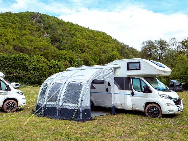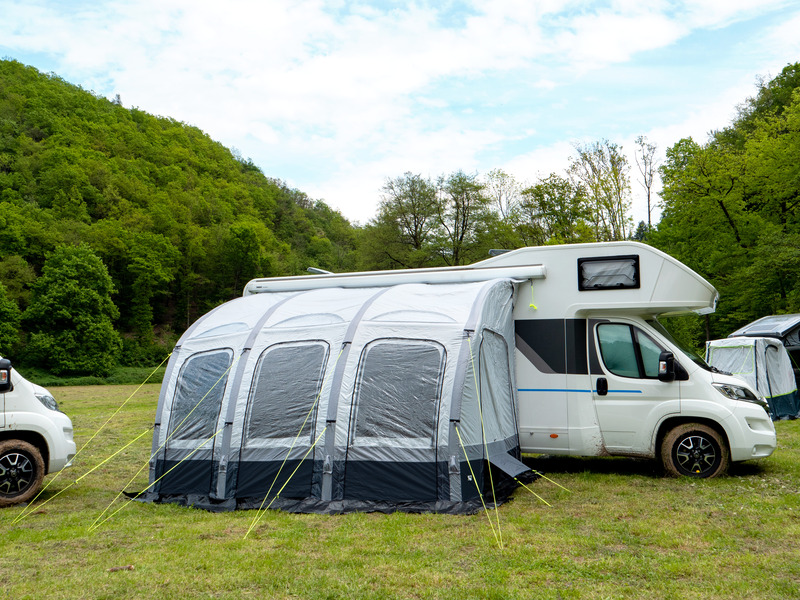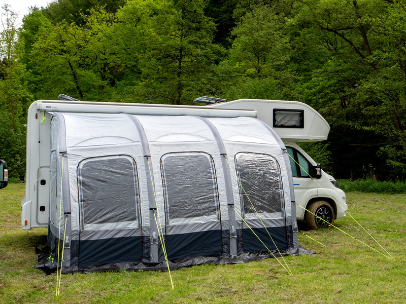 Die Reisemobil-Luftvorzelte Marina Air High in klassischer Form mit nur einem Luftschlauch für einen schnellen Auf- und Abbau in Premium-Qualität. Die Front mit 3 großen Fenstern besteht aus 3 Lagen (transparentem PVC, Moskitonetz und Abdeckung innen) und kann komplett geöffnet werden. Außerdem können alle Front-Panels entnommen oder als Sonnensegel genutzt wer-den. Die Seitenwände haben eine Tür und ein Moskitonetz-Fenster mit Abdeckung außen.