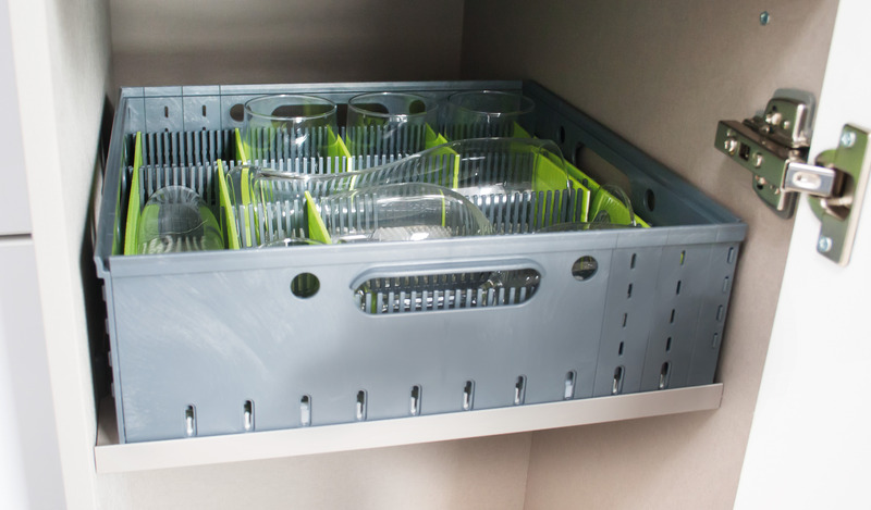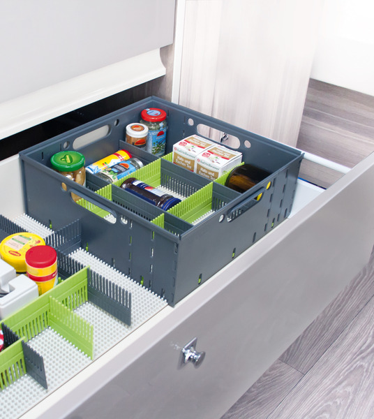 Endlich Ordnung. Nichts bricht, nichts klappert. Stapelbar, stabil und schnell verstaut und bieten Platz für viele Artkel- ob Lebensmitel, Gläser, u.v.m. geeignet – auch für Echtglas super. Hoher Tragekomfort. Inkl. 4 Stauleisten; diese passen exakt auf die Noppenplate. Einfach aufstecken. Die Seitenwände, Noppenplate und die Stauleisten sind an den Perforatonen kürzbar.