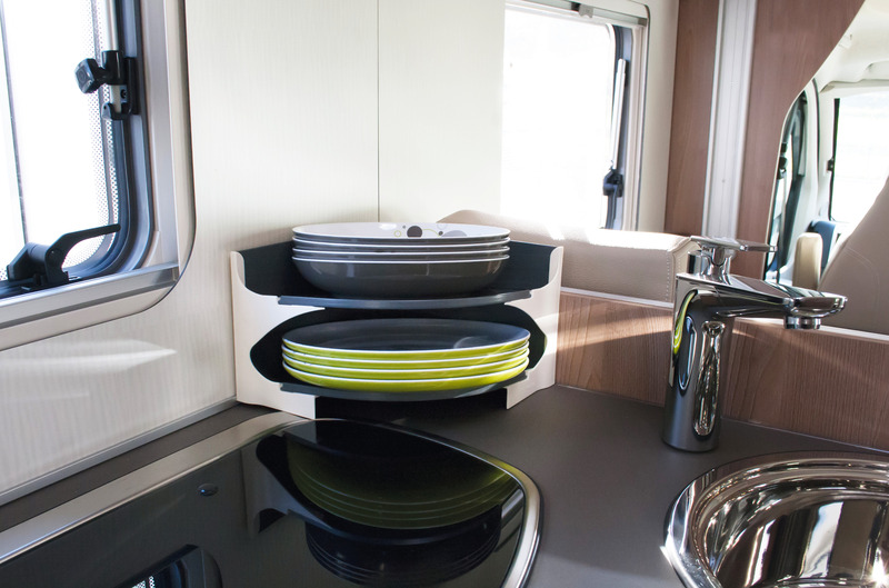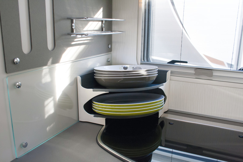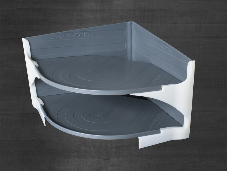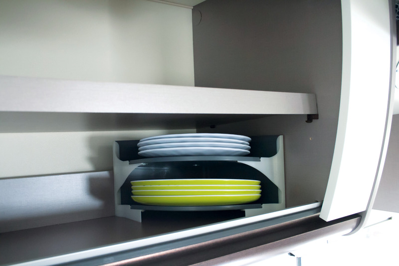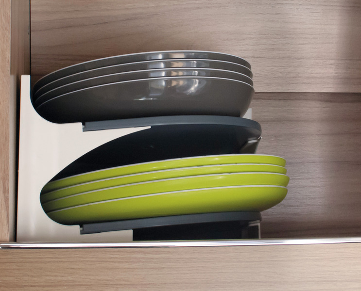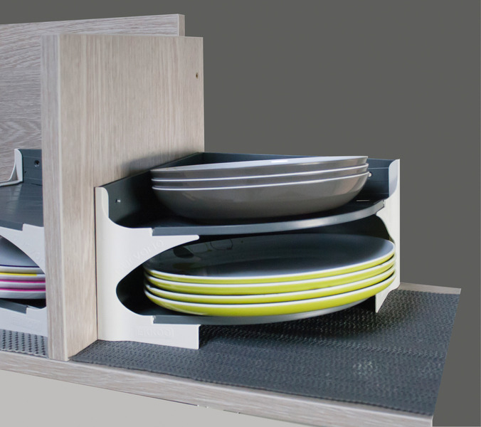 Geräuscharmer, formsicherer Transport von Tellern und Untersetzern. Platzsparend, geringes Gewicht, auch für niedere Schränke nutzbar. Optimale Standsicherheit durch einpassen in der Schrankecke. Die abfallende Auflagefläche sichert zusätzlich die Teller.