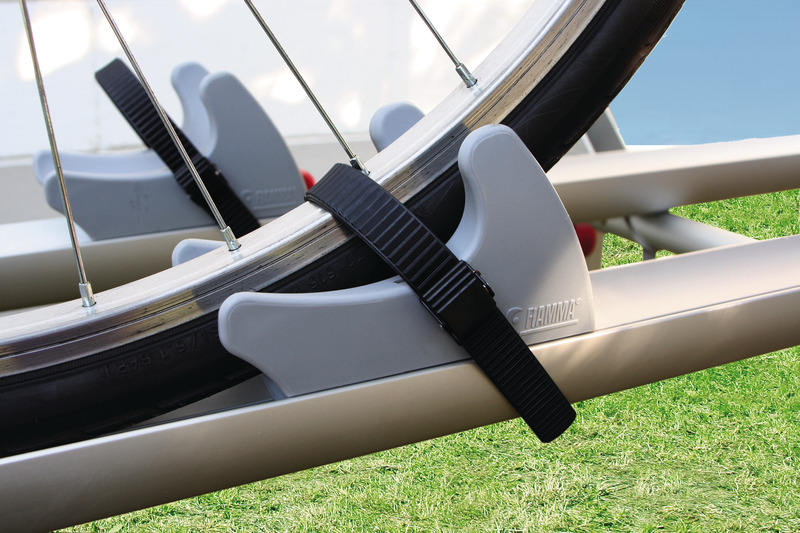 Schiene kann verstellt werden. Mit stabilem Zurrgurt für die Felgenbefestigung. Gurt läuft in der Führung der Fahrradschiene.