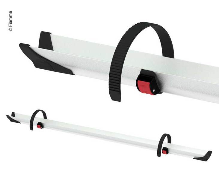 Robuste und verstärkte Schiene mit doppeltem Boden mit zwei Quick-Safe-Riemen. Vorgebohrt für die einfache Montage an Fahrradträgern aller Marken. Max. Traglast der Schiene 30 kg.