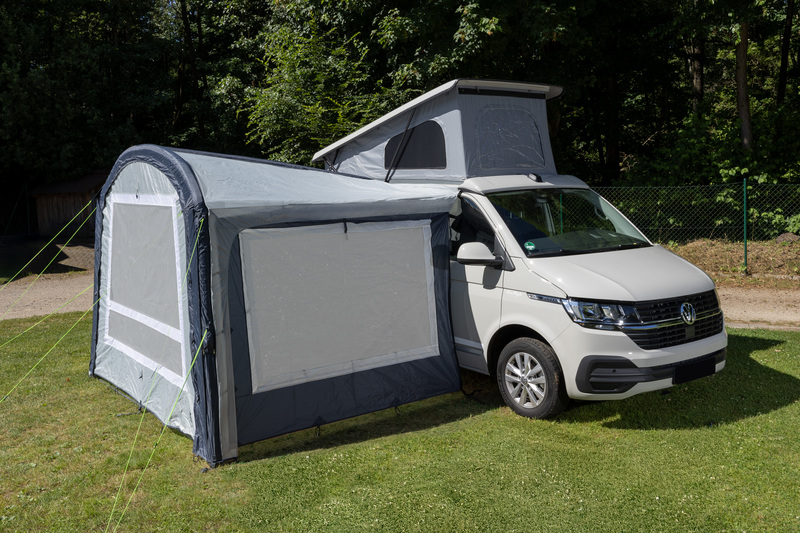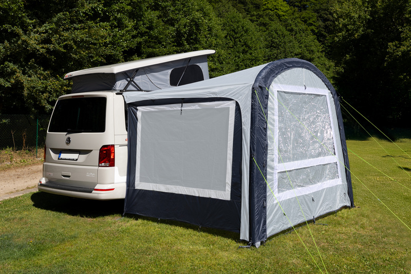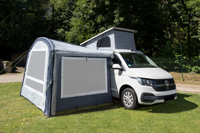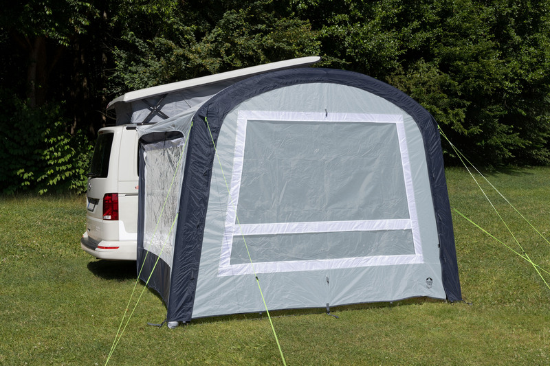 Für Campingbusse mit einer Kederschienenhöhe 1,80 bis 2,20 m.Das Sonnensegel wird zum Vorzelt durch 2 Seitenwände zum Einhängen und einer Frontwand zum Einzippen. Alle Wände mit großen transparenten Fenstern und innerer Abdeckung.