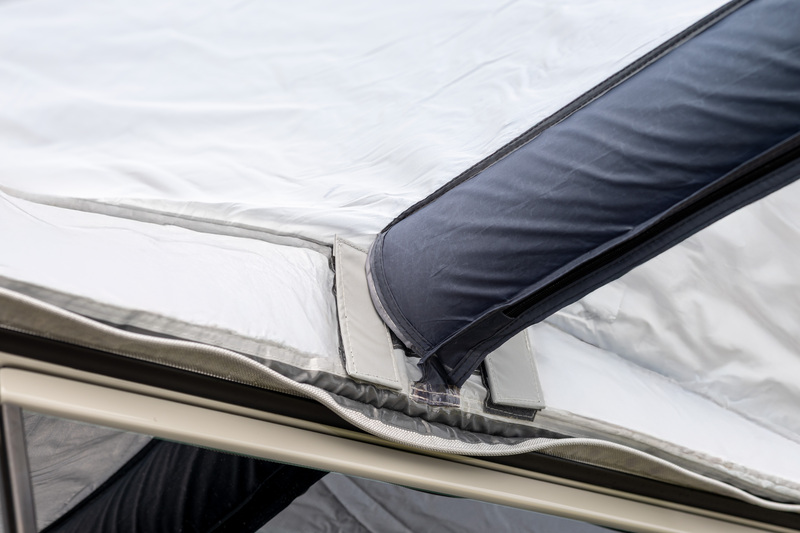 Sonnensegel mit Luftschlauch, 2 Seiten- / 1 Frontwand, 2 x Dachstangen Stahl, Abspannleinen, Heringe, Packtasche und Luftpumpe, Kederstop