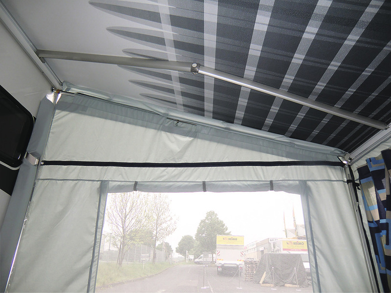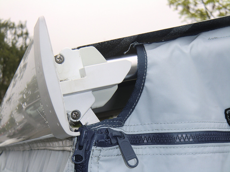 Reisemobil- oder Wohnwagen-Markisenvorzelt für Markisen mit Wandmontage und Anbauhöhe von 250-280 cm. Die Abdichtung am Fahrzeug durch große Schaumpolster verhindert Zugluft, verstärkte Abspannpunkte sorgen für standfeste Montage. Die Seitenwände mit Reißverschlüssen können entfernt werden. Ein Dichtstreifen wird mit Clips und Klettverschlüssen am Markisentuch befestigt und sorgt für einen wasser- und winddichten Abschluss.