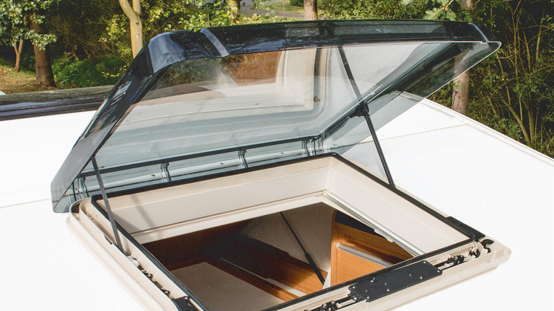 Dachfenster mit stabiler Kunststoffrahmen-Konstruktion, Einbau längs und quer zur Fahrtrichtung möglich, integriertes, seit Jahren bewährtes Rollosystem, hervorragende Isolationseigenschaften dank doppelter Isolierscheiben aus getöntem Acryl, engmaschiges Insektenschutz-Rollo, wirksam auch im Randbereich. Mit Standart Rahmen ohne Lüfter.