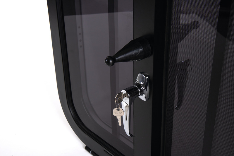 Fenster für Pferdeanhänger mit Schutzgitter. Bietet Belüftung sowie Schutz vor Insekten durch integriertes Moskitonetz. Lässt sich von außen verriegeln und abschließen. Für 40 mm Wandstärke. Eclradius 100 mm. TIPP: Auch als Sicherheitsfenster einsetzbar.