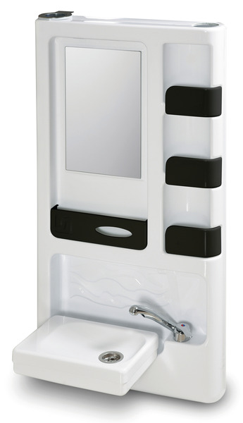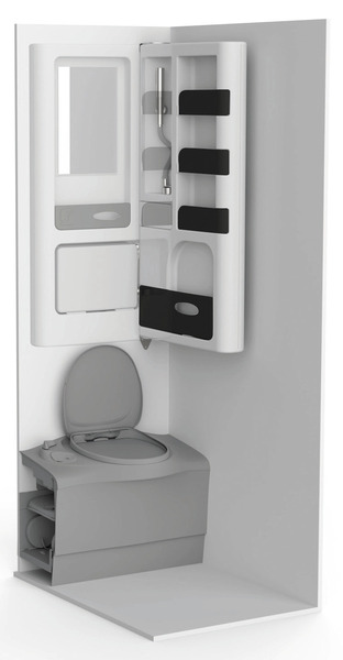 Der Hängeschrank hat eine Seite mit einem klappbaren Waschbecken, einem Spiegel und Ablagefächern. Die gegenüberliegende Seite hat zusätzliche Ablagefächer. Maße mit hochgeklapptem Becken: H97 x B60 x T13 cm, Gewicht: ca. 8,6 kg.