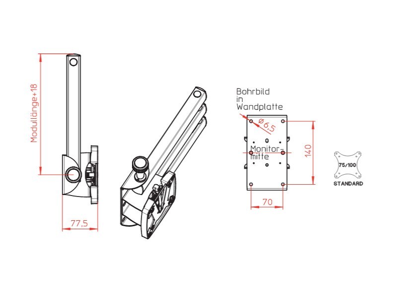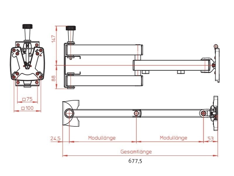 Dieser TV-Halter hat einen großen Schwenkbereich und Arretierungsbolzen. Er ist sehr leicht, hochwertig verarbeitet, bietet ein edles Design und eine große Tragekraft von bis 10 kg. Eine Schnellverschlussplatte ermöglicht ein schnelles Abnehmen des TFT. Der Halter funktioniert auch noch bei sehr hoch hängendem TFT. Der Doppelgelenkarm hat eine Aufbauhöhe von 65 mm und eine Armlänge von 350 mm. Der Auszug weist 780 mm auf.