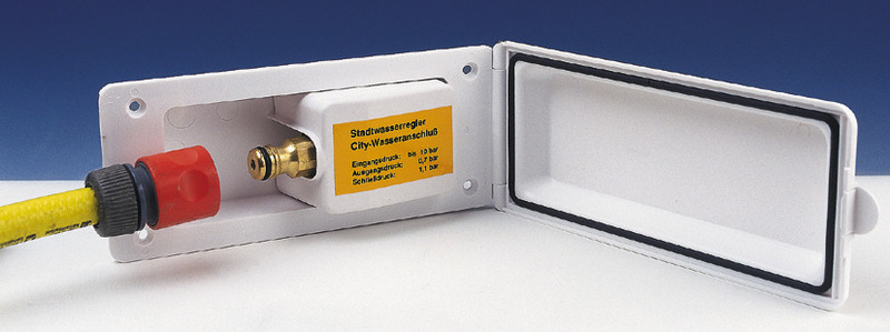 Einspeisung aus dem öffentlichen Wassernetz ins Wohnmobil oder Caravan. Mit Druckminderer auf 1,4 bar Ausgangsdruck und 2 bar Schließdruck. Anschluss über Gardena Steckkupplung.