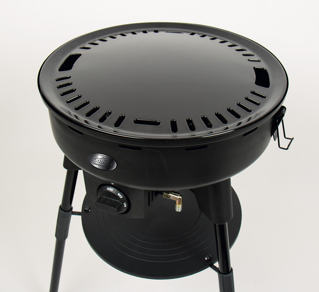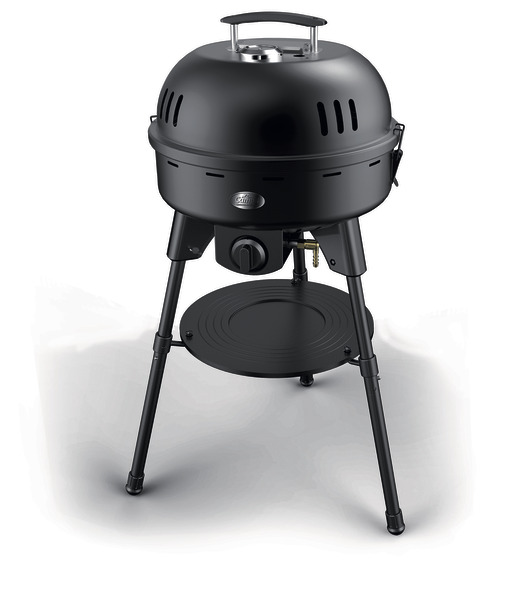 Gasgrill mit 3 höhenverstellbaren Metallbeinen und Kunststoff-Standfüßen. Bequeme Arbeitshöhe, 67 / 98 cm. Kann ohne Metallbeine auch als Tischgrill verwendet werden, 30 mbar. Mit Linksgewinde (EU).