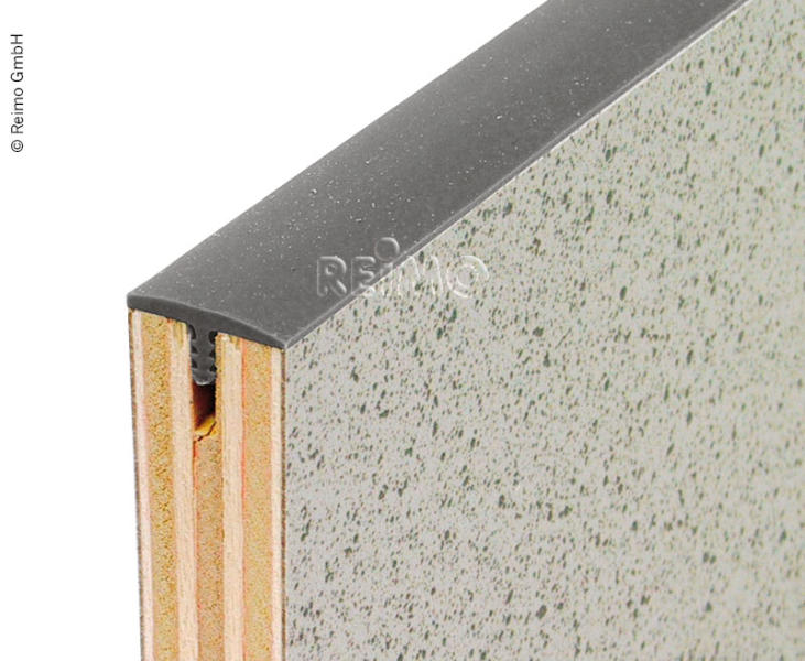 Standard 15 mm T-Umleimer. Schützt die Holzkante und bietet hohe Stabilität. Wird in die gefräste Nut eingeschlagen. Farbe: mittelgrau