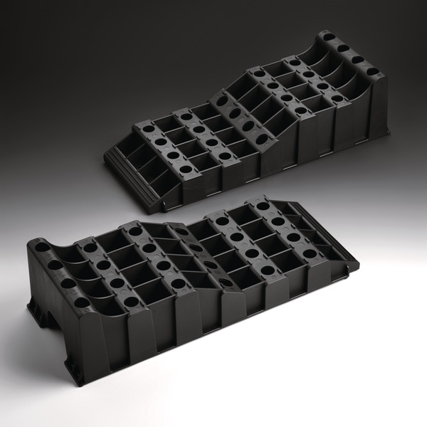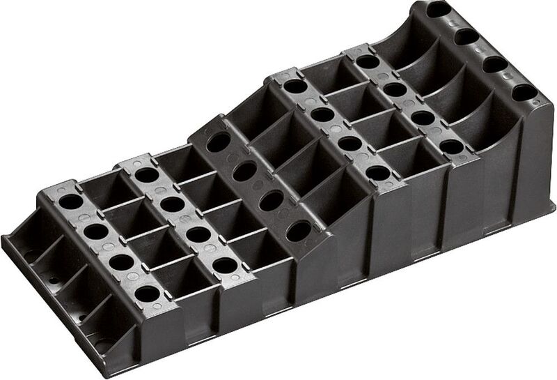 Der Stufenkeil XL vereinfacht sicheres Auffahren und stabilen Stand auf einer großen Fläche. Bis 20,0 t zulässiges Gesamtgewicht, 5.000 kg pro Rad.