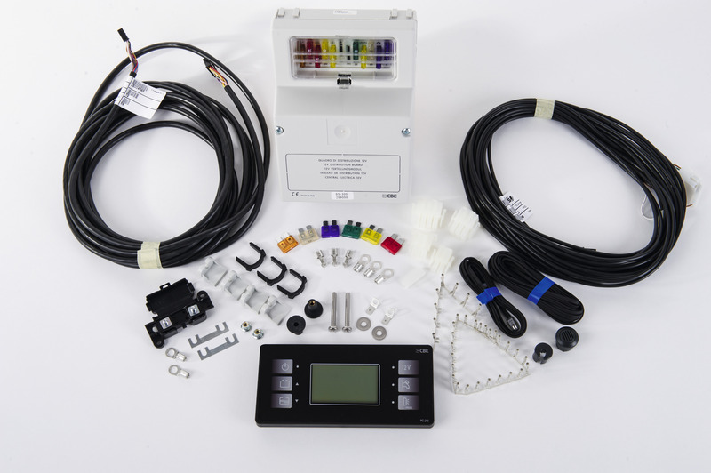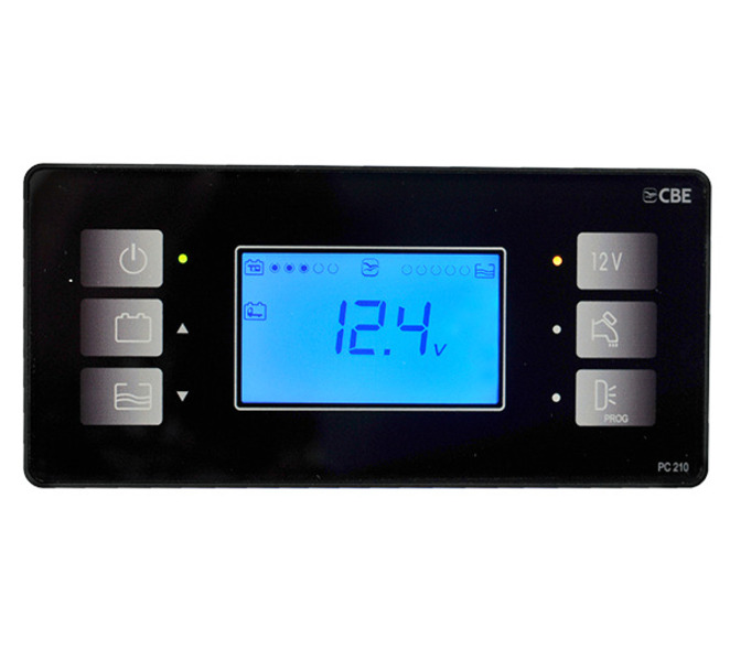 Mikroprozessorgesteuertes Komplettsystem mit LED Control Panel zur Überwachung der Fahrzeug- und Verbraucherbatterie (B1-B2), Überwachung des Frischwassertanks, Alarm bei vollem Abwassertank, Pumpe, Außenlicht, Relais für den parallelen Anschluss der Batterien, Kühlschranksteuerung, Sicherungen, Nachladung der Fahrzeugbatterie, Überwachung und Steuerung der Einrichtung für den Batterieschutz, Anzeige Innen- und Außentemperatur.