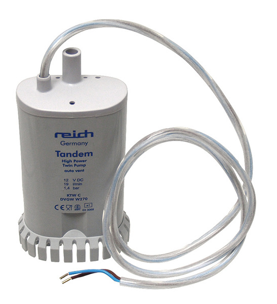 Eine Besonderheit dieser von REICH entwickelten Tauchpumpe ist die Bestückung mit zwei Pumpenmotoren. Diese sorgen für eine außergewöhnlich hohe Leistung bei Fördermenge und Druck und machen die Tauchpumpe TANDEM besonders zuverlässig. Selbst bei einem Ausfall einer der Pumpenmotoren arbeitet die TANDEM mit reduzierter Leistung weiter. Durch die spezielle Anordnung der Motoren ist dies auch bei niedrigem Füllstand im Tank gewährleistet. Die Tauchpumpe TANDEM hat serienmäßig eine automatische Entlüftung. Trinkwasserkonforme 12 V Tauchpumpe für Rohrsystem mit Außen-ø 12 mm. Mit 2 Motoren.