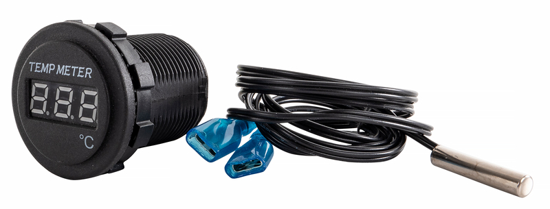 ✔ 1 Temperaturanzeige, 1 Temperatursensor (Kabellänge 1030 mm), 2 vollisolierte Flachsteckhülsen