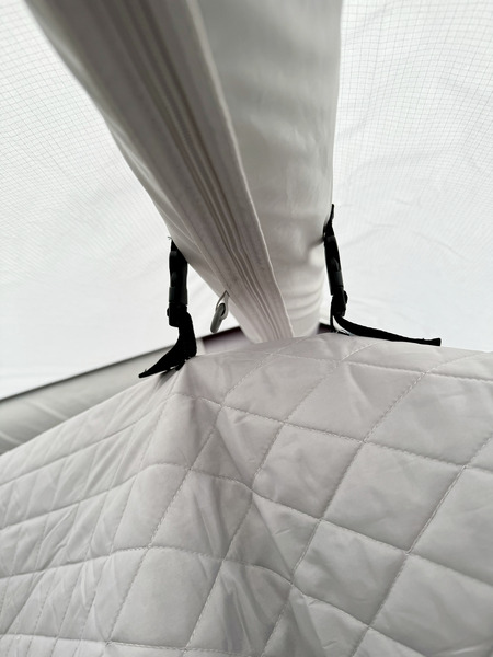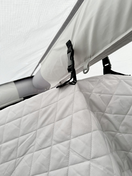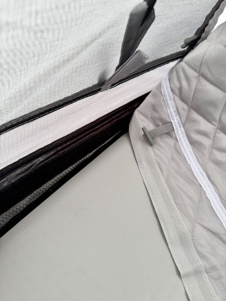 Das Thermocover ist leicht im Inneren des Dachzeltes per Clips zu montieren. Schnell abnehmbar. Lieferung in einem Packsack.