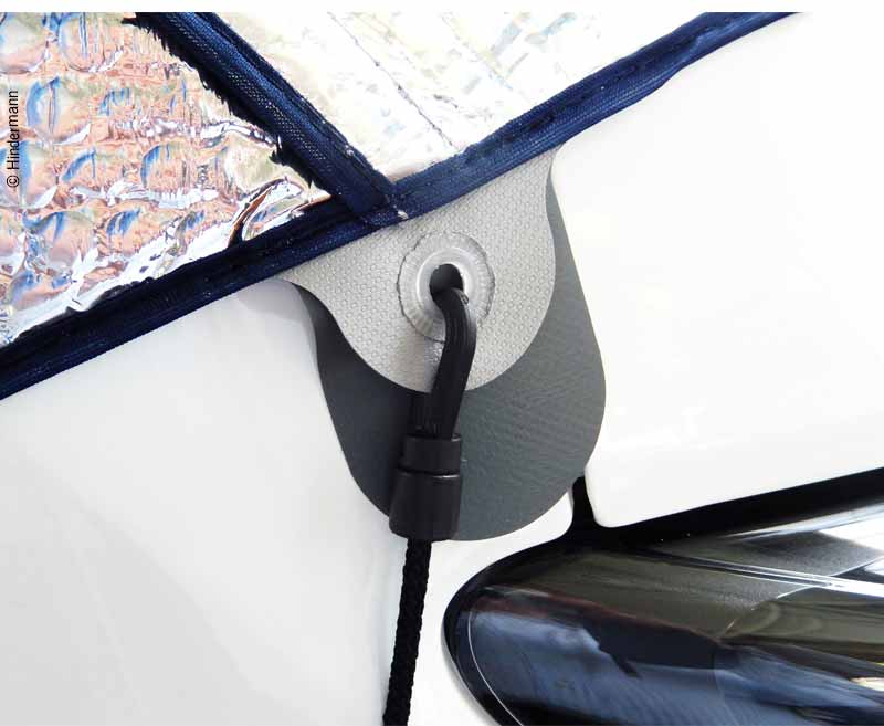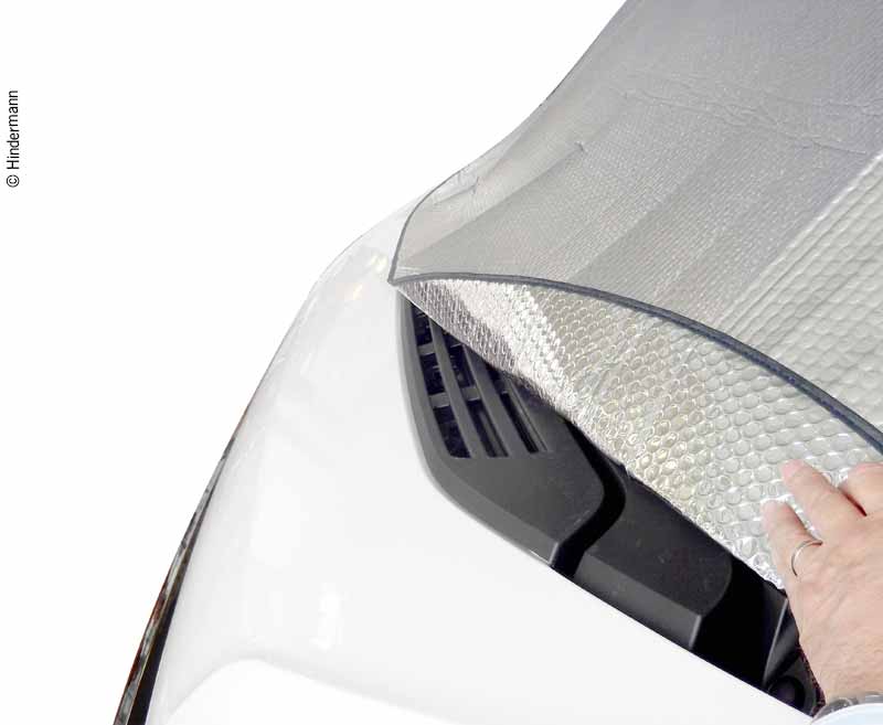 Einteilige, abklappbare Außen-Isoliermatte für teilintegrierte + Alkoven-Reisemobile + Kastenwagen: Schutz vor Hitze und Kälte, Rundum-Isolierung des Fahrerhauses. Alubedampfte Oberfläche reflektiert die Sonneneinstrahlung.