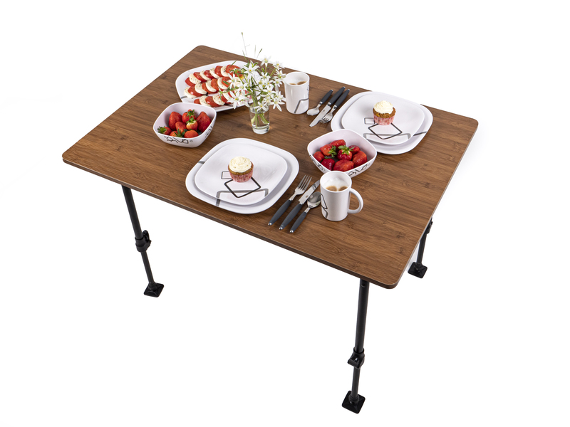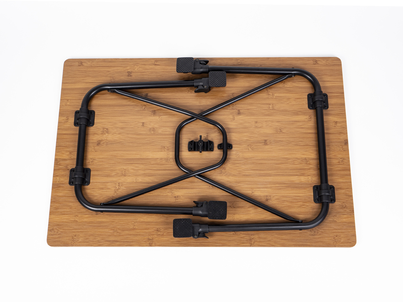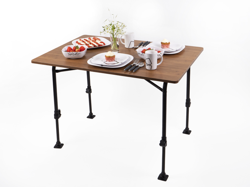 Der neue leichte Camp4 – Campingtisch TJÖRN punktet mit einer wetterfesten Tischplatte im Bambus-Dekor. Die großen Tellerfüße verhindern das Einsinken und sorgen für einen stabilen Stand. Die matt-schwarz lackierten Tischbeine sind mit einem Handgriff stufenlos höhenverstellbar von 51-71cm. Der Tisch ist mit 50kg überdurchschnittlich belastbar und bietet Platz für 2-4 Personen.