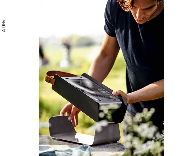 Der stylisch tragbare Holzkohlegrill für unterwegs. Die Abdeckung dient gleichzeitig als sichere Basis für den Grill. Zwei Höhen über der Holzkohle und Vertiefungen für handelsübliche Spieße sorgen für ultimativen Benutzerkomfort. Die Edelstahlteile sind Spülmaschinen geeignet.