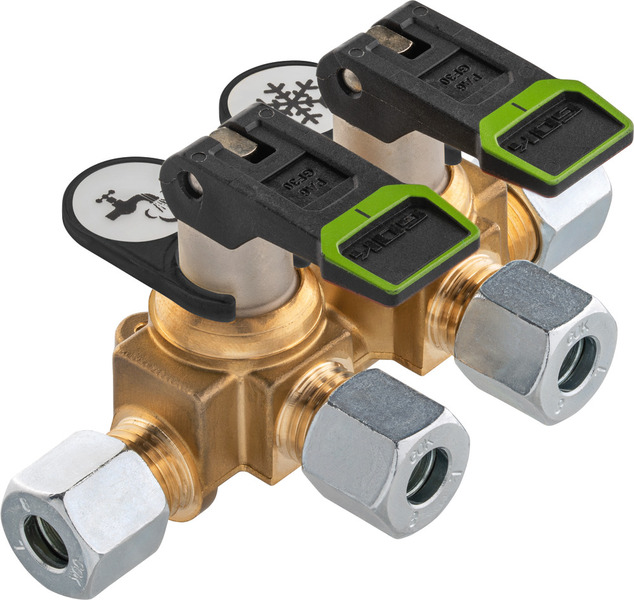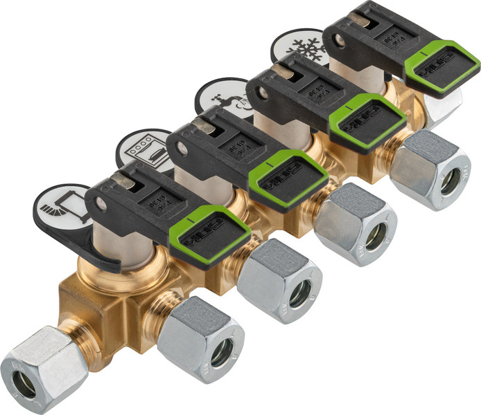 Verteilerblock kurz Schnellanschlussventil Typ KSV mit Überwurfmutter Typ M und Schneidring Typ D, Ausführungen mit 1 oder mehr Abgängen.