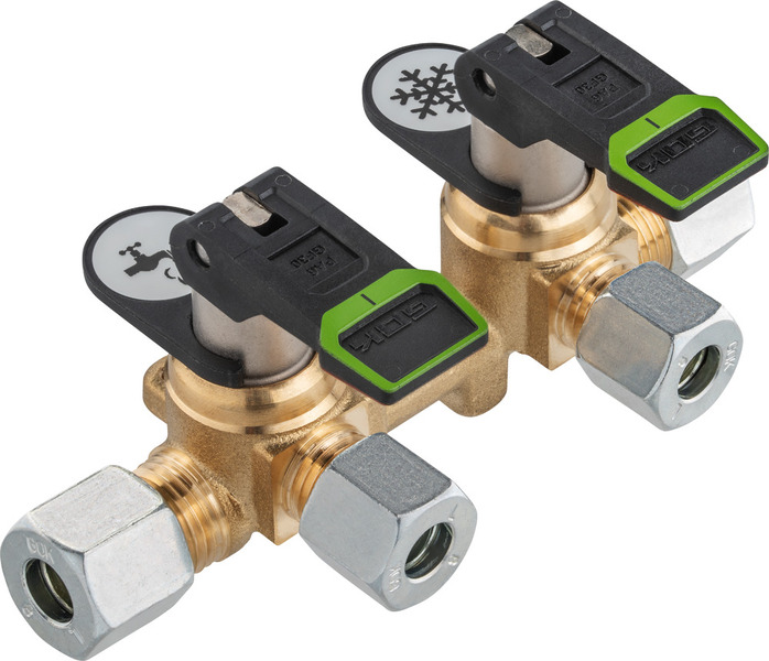 Verteilerblock normalgroß Schnellanschlussventil Typ KSV mit Überwurfmutter Typ M und Schneidring Typ D, Ausführungen mit 1 oder mehr Abgängen.