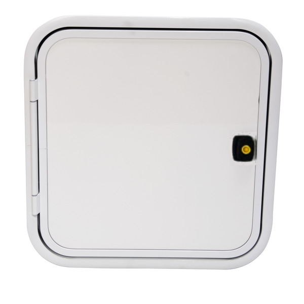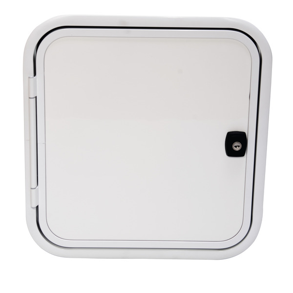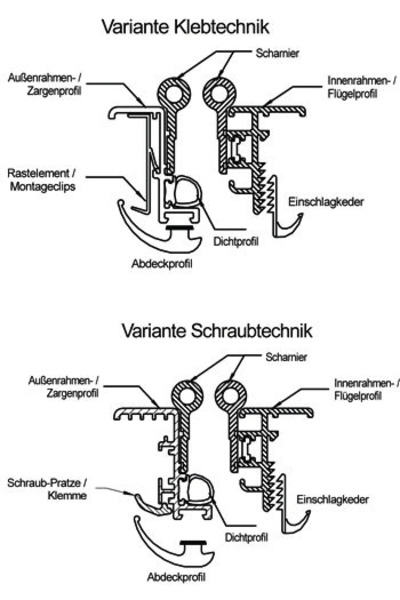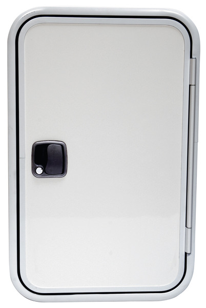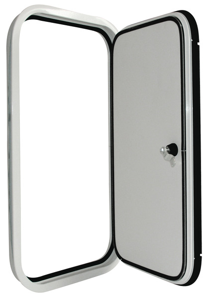 Das Klappen-/Türsystem 2000 besteht aus einem pulverbeschichteten Aluminiumrahmen und einer Füllung bestehend aus weißem Glattblech (Außenseite), Isolation aus blauem Styrofoamschaum und einer weißen Dekorplatte aus Polystyrol 1,5 mm (Innenseite).
