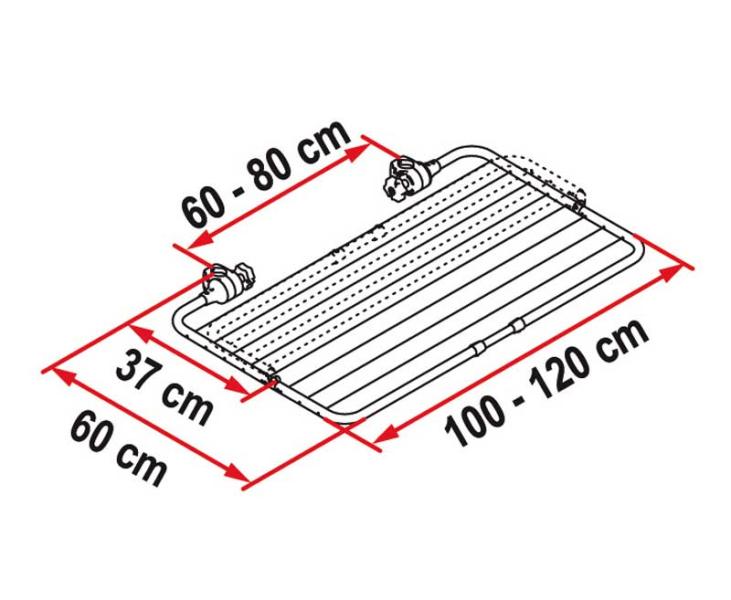 Wäschetrockner zur Montage am Auflagebügel der meisten Fahrradträger (Rohr mit Durchmesser 35mm). Mühelose Montage ohne Bohren, da sich die Endstücke am Auflagebügel einrasten lassen. Das Klappbare Gestell aus eloxiertem Aluminium kann während der Fahrt montiert bleiben.