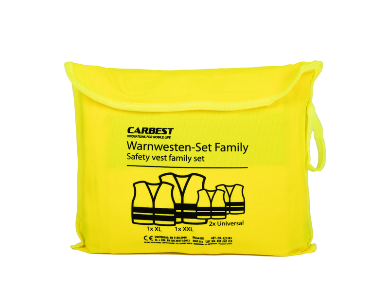 Im Pannenfall muss beim Verlassen des Fahrzeuges eine Warnweste getragen werden. Die vorgeschriebene Farbe ist in den meisten Ländern Gelb. Das 4-teilige Westen-Set besteht aus 1 XXL Weste und 1 XL Weste nach der EN ISO 2047 und 2 Universal-Westen nach der EN 1150: 1999.