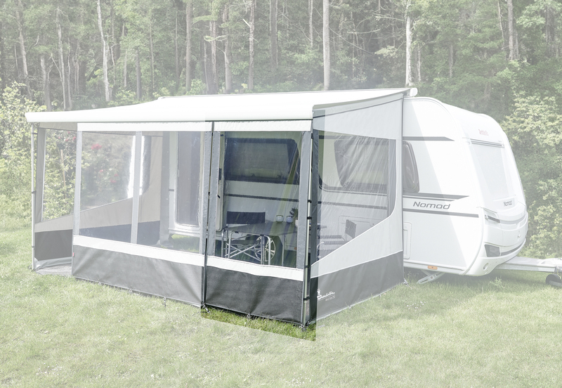 Die Seitenwand ist 240 cm breit und passt somit perfekt bei Markisen mit 250 cm Auszug.