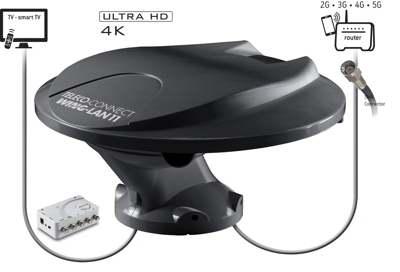 WING-LAN11 integriert eine TV-Allrichtungsantenne für digitale terrestrische Signale DVBT/T2 und Radiosignale DAB+ mit einer hocheffizienten Internetantenne für 2G-3G-4G-5G Signale. Angeschlossen an den TELECO-Router (Art. Nr.491944) entsteht ein WLAN-WiFi-Hotspot, damit Sie im Internet navigieren und sich Ihre Lieblingssendungen auch per Streaming ansehen können.
