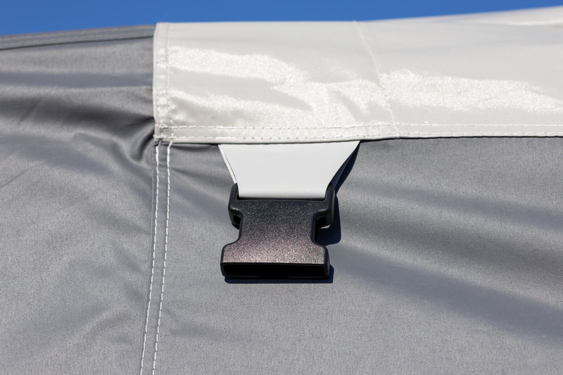 Die Vorderwände mit großem transparentem Fenster mit Außenabdeckung und 1 seitlich aufrollbare Tür und sind unabhängig voneinander per Reißverschluss komplett herausnehmbar. Die Seitenwände mit Tür und Fenster mit Moskitonetz-Einsätzen sind seitlich aufrollba und ebenfalls herausnehmbarr.